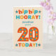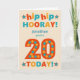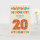 Eine helle und fröhliche Geburtstagskarte, die Sie auf der Vorderseite individuell gestalten können, mit farbenfrohen Buchstaben auf cremefarbenem Hintergrund. Die Titelgrüße ist "angesagt angesagte HOORAY! (Platz, um den Namen hinzuzufügen), du bist 20 Jahre alt TODAY!' in einem kühlen, farbenfrohen Drehbuch. Die rote Nummer 20 ist extra groß und hat große Punkte in goldgelb und grünlich blau. Die Insider-Nachricht ist nur ein Vorschlag, und Sie können sie einfach ändern oder löschen, wenn Sie etwas Anderes oder gar nichts in einer Nachricht drucken möchten.
