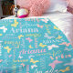 Niedliche kleine grafische Kontur Schmetterlinge personalisiert Namensdecke. Diese gedämpfte aqua, weich blau, rosa, grün, gelb und korallen Text typografische Decke kann auch mit Ihrem eigenen kurzen Namen, derzeit liest Ariana. Andere Namen und Farben verfügbar oder kontaktieren Sie mich für Namenswünsche. Originale Kunst und Design von Sarah Trett für www.mylittleeden.com