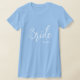 Der T - Shirt von Frauen wird in einem Crew-Hals und kurzen Ärmeln Stil in Babyblau mit weißem Text gezeigt: Braut und ein benutzerdefinierter Sample-Name. Passen Sie diesen Artikel an und ändern Sie den Beispielnamen in Ihren Namen oder kaufen Sie, wie es ist.