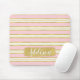 Trendy, chic und feminin hellrosa, goldfarbene und weiße Streifen Muster. Ein künstlerisches goldenes Pinselschild mit einer anpassbaren Cursiv-Namensvorlage. Der Goldfolieneffekt der Imitate ist Teil des grafischen Printes, nicht die eigentliche goldene Folie.