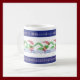 Diese Tasse zeigt drei Weihnachtsfiguren, Schwimmen und Bären. Sie sind in Piktogramm-Form, grün und tragen festliche Hüte. Oben und unten befindet sich eine marineblaue Band mit stilisierten Poinsettia-Blume, die in den Weihnachtsfarben Rot, Weiß und Gold übereinstimmen. Sie können die Tasse auch personalisieren, indem Sie einen oder mehrere Initialen hinzufügen.