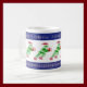 Diese Tasse zeigt fünf Weihnachtsfiguren, Laufen und Tragen Geschenke. Sie sind in Piktogramm-Form, grün und tragen festliche Hüte und Stiefel. Oben und unten befindet sich eine marineblaue Band mit stilisierten Poinsettia-Blume, die in den Weihnachtsfarben Rot, Weiß und Gold übereinstimmen. Sie können die Tasse auch personalisieren, indem Sie einen oder mehrere Initialen hinzufügen.