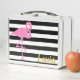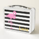 Ein rosa Flamingo ist auf der links Seite stehend. Diese MetallBrotdose hat ein gestreiftes Schwarzweiss-Muster als der Hintergrund. Personifizieren Sie den Mittagessenkasten, indem Sie den Namen der Empfängers im Skript des Imitats (nicht Folie) Goldin der unteren rechten Ecke hinzufügen.