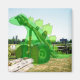 Ein fröhlicher, grüner Cartoon-Stegosaurus sitzend auf dem Boden, starrend auf den Himmel bis zum verlassen Rahmen überlagert über das Foto einer alten Maschine mit großen Rädern, bildet ein "Skelett" für den Dinosaurier.