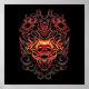 Eine dämonische Figur, die in Dunkelheit umhüllt und mit Hörnern und Skelettstücken verziert ist, führt ein Ritual durch. Die Hände der Figur sind ausgestreckt zu einem leuchtenden Schädel auf einem Sockel, umgeben von Flammen und wirbelndem Rauch.