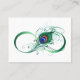 The symbol of infinity with a bright, green, artistic peacock feather on a white background. Tattoo style.