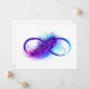 Infinity symbol with a beautiful feather painted in purple and blue bright colors on white background.