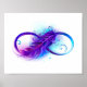 Infinity symbol with a beautiful feather painted in purple and blue bright colors on white background.