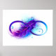 Infinity symbol with a beautiful feather painted in purple and blue bright colors on white background.
