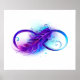 Infinity symbol with a beautiful feather painted in purple and blue bright colors on white background.