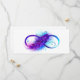 Infinity symbol with a beautiful feather painted in purple and blue bright colors on white background.