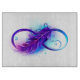 Infinity symbol with a beautiful feather painted in purple and blue bright colors on white background.