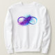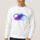 Infinity symbol with a beautiful feather painted in purple and blue bright colors on white background.