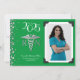 Célébrez le nouveau diplômé de l'école de sciences infirmières avec ce faire-part de diplôme en argent RN caduceus en vert! Elégant avec une bordure photo vintage et des accents de confettis argentés! Parfait pour toute personne diplômée en tant qu'infirmière avec son baccalauréat en sciences infirmières!