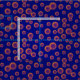 Gewebe mit Grippeviren bedeckt, die wie ein Elektronenmikroskop aussehen. Auf dunkelblauem Hintergrund in Neonorange gefärbt.