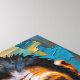 The background burns in saturated oranges and tidal blues, not as landscape but as atmosphere, a psychological climate. It suggests the heat of emergence, the molten corridor between instinct and awareness. The paint moves in thick, sculpted gestures, echoing the raw tactility of survival while hinting at something more luminous forming beneath the fur and bone.