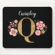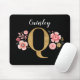Ein wunderschönes, mit Monogramm, rosafarbenes Blumenmousepad mit rosa Blume und einem goldenen monogramm-Buchstaben Q auf schwarzem Hintergrund. Personalisieren Sie das Mauspad, indem Sie unter dem Monogramm Ihren Namen hinzufügen. Macht ein lustiges Geschenk für einen Freund oder für eine Brautjungfrau. Entworfen für Sie von BlackBerry Boulevard.
