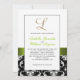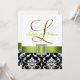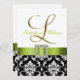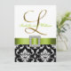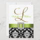 L'élégance sophistiquée est donnée par cette belle conception de faire-part de mariage. Un motif floral noir et blanc de damassé sert d'arrière - plan à un effet de photo de l'initiale métallique "L" d'or et d'une broche de ruban et de diamant de satin de vert de chaux TOUT IMPRIMÉE aux invitations PLATES de mariage de CARTE. Une manière parfaite d'inviter vos invités à votre mariage. Le contemporain, pourtant le motif classique de damassé avec une conception qui vous permet de personnaliser l'avant avec vos noms et le dos est libre pour ajouter votre texte customisé de faire-part de mariage. Le faire-part de mariage est placé pour l'initiale "L" de monogramme. Pour d'autres lettres et couleurs veuillez contactent le concepteur chez luxuryweddinginvitations@gmail.com. Conception de disposition d'Elke Clarke©. Graphiques autorisés. En outre, choisissez d'une série de polices et beaux papiers de rendre vos invitations de mariage PARFAITES !
