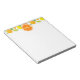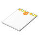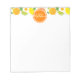 Ein weiße Notizblock mit einem Muster aus orangefarbenen, Limonen, Grapefruit- und Zitronenfiguren mit grünen Blätter. Oben steht eine Name- und Monogramm-Kombination, die individuell angepasst werden kann. Das Pad ist größtenteils leer und hat viel Platz zum Schreiben.
