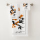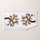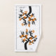 Cerisier de sakura inséparables orange avec fleurs et serviette de bain noire. Il comprend un sakura noir avec des fleurs orange et des coeurs noirs au centre et une paire d'inséparables. Votre nom est écrit dans une police de style script.