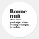 Bonne Nuit. Gute Nacht. Inspiration und motivierend französisches Zitat-Design für diejenigen, die die schöne und romantische französische Sprache Liebe. Coole Wörterbuchdefinitionsartikel gemischt mit witziger Sarkasmus und leichtem Spaß. Wer sagt, man kann nicht lustig, chic und cool sein, während man andere mit diesen aufschlussreichen Worten und Redewendungen des Lebens inspiriere. Große Souvenirs, Weihnachtsgeschenke und Geburtstagsgeschenke für diejenigen, die davon träumen, nach Paris zu reisen und auf dem Eiffelturm in Liebe zu fallen.