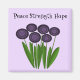 Ein lila Blumendesign mit violetten Blumen, grünen Stielen und Blattwerk. Ein Sprichwort der "Friedenskraft"-Hoffnung. Die Wörter können auf Wunsch geändert werden.