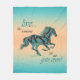 Lassen Sie sich in diesem "One of a Kind" Inspiration Pferd Fleece Blanket verführen! Es verfügt über eine einzigartige Galopp Pferde Silhouette in Türkis, Schwarz & Gold auf einem türkisfarbenen und orangen Sonnenuntergang und die Inspirierend Worte ... "Live like jemand Verlassen The Gate Open"! Dies ist ein Original Grafikdesign von Artist Kerry Miller.