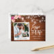 Modernes Pinselskript, Sofortkamera Stil, Foto Save the Date Foto Verlobung Ankündigung Postcard - Rustikales Land Holz, Mason Jar String Lights. Das Angebot umfasst eine farbenfrohe Blüte mit rosa Rosen und botanischem Grün.