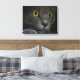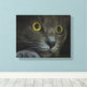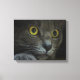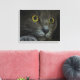 Eine nah-up-Aufnahme des Gesichts einer grauen Katze mit gelben Augen und verdünnten Schülern, die den Kopf auf der Pfote ruht und etwas hinter der Kamera scharf starrt.
