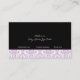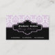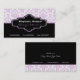 Carte de visite aux intérieurs damassés de couleur violet noir, avec motif damassé violet et blanc. La partie inférieure est de couleur noire solide. Une bande noire et une bande violette séparent les deux parties. Votre entreprise/nom est tapé sur un élégant étiquette noir aux contours blanc et violet.