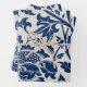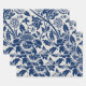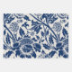 Intricate blue floral pattern on a light background, featuring stylized blooms and curling leaves, evoking a vintage, elegant feel.