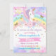 Girl birthday invite, unicorn, rainbow, stars, gold glitter.