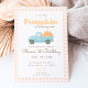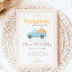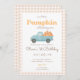 Featuring a cute blue truck filled with pumpkins, warm neutral gingham border, and elegant autumn tones — perfect for a baby boy’s fall celebration.