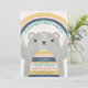 Cette invitation à une fête d'anniversaire mignonne présente un ours gris adorable avec un ventre rayé de couleurs arc-en-ciel tenant un arc-en-ciel aux mêmes couleurs. Les couleurs incluent le gris, le bleu marine, le moutarde, le vert clair et le pêche.
