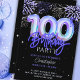 Fêtez un anniversaire marquant dans le style avec notre invitation personnalisée à 100e anniversaire avec des numéros de ballons bleu iridescente en feuille d'aluminium! Cet élégant design présente un arrière - plan noir orné d'une superbes superposition de feux d'artifice et d'étoiles bleus, violets, argentés, ce qui en fait le choix idéal pour une fête festive et élégante. Les numéros de bulle de papier ajoutent une touche de luxe, tandis que la police de script ajoute une touche personnalisée et unique. Cette invitation est parfaite pour une fête du 100e anniversaire pour lui ou elle. Rendez sa journée spéciale encore plus mémorable avec cette invitation colorée et sophistiquée !