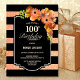 Dîner de 100e anniversaire avec des coraux rayés noirs et faux parties scintillant invitation.