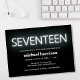 Cool, moderne et simple invitation de 17ème anniversaire avec "dix-sept" écrit en néon blanc brillant contre un arrière - plan noir.