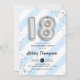 18e anniversaire de fête d'invitation. Design élégant en argent de parties scintillant faux avec des rayures bleu et blanc d'aqua turquoise. Carte Invitation avec le numéro d'argent 18 ballons, police de script avec confetti. Parfait pour une élégante dix-huitième célébration anniversaire. Message-moi si vous avez besoin d'âge personnalisé.