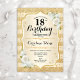 Invitation du 18e anniversaire. Design floral élégant en or et blanc. Comprend des rayures d'or de parties scintillant, des roses blanches, des polices de caractères stylisées et des confettis. Parfait pour une fête d'anniversaire glam.