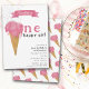 Une belle crème glacée rose dessinée à la main design invitation anniversaire. Une jolie "One happy girl" été sur le thème de la première invitation de fête d'anniversaire. Un beau thème d'invitation à l'anniversaire d'été de la crème glacée qui peut être customisé à vos détails.