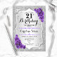 Invitation du 21e anniversaire. Design floral élégant en argent et violet. Comprend des bandes d'argent faux parties scintillant, des polices de caractères et des confettis de style rose violet. Parfait pour une fête d'anniversaire glam.