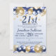 Une invitation à la fête du 21e anniversaire. Le design comprend des ballons bleu marine et or, des étoiles de gloire or et du texte bleu marine sur un arrière - plan bleu pâle dégradé. Un joli design invitant vos invités à se joindre à vous pour une fête du 21e anniversaire. Facile à customiser avec les détails de votre propre fête.