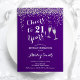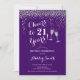 Invitation du 21e anniversaire. Salutations À 21 Ans ! Design élégant en violet, blanc et argent. Il comprend des verres à champagne, des caractères de script et des confettis en argent parties scintillant. Parfait pour une fête d'anniversaire élégante. Personnalisez avec vos propres détails. Peut être customisé pour montrer n'importe quel âge.