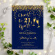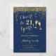 Invitation du 21e anniversaire. Salutations À 21 Ans ! Design élégant en marine et en or. Il comprend des verres à champagne, des caractères de script et des confettis. Parfait pour une fête d'anniversaire élégante. Personnalisez avec vos propres détails. Peut être customisé pour montrer n'importe quel âge.