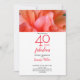 Envoyez des invitations à des fêtes de 40e anniversaire magnifiques, modernes et personnalisables pour une célébration de quarantième anniversaire. L'invitation présente une belle photo de pétales de fleurs d'hibiscus rose orange au-dessus d'un design typographique "40 et fabuleux" avec du texte rouge orange sur un arrière - plan blanc. Sur le dos, on peut voir la photo complète de l'éclatante floraison tropicale. Customisez le nom et les détails du parti dans la barre latérale. Photographie de Fleur d'Hibiscus rose, Copyright ©Claire E. Skinner. Tous droits réservés.