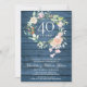 Avec une délicate guirlande de fleurs de greenery aquarelle sur un fond de panneaux de bois rustique bleu, cette invitation d'anniversaire de mariage chic et botanique peut être personnalisée avec vos informations spéciales d'anniversaire rubis. Le verso présente une guirlande florale assortie encadrant vos dates d'anniversaire en texte blanc élégant sur un fond rubis. Conçu par Thisisnotme©