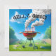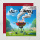 Grill rouge grillant hot dogs avec beaucoup de fumée sur une pelouse verte pour 4 juillet. Tout le texte est modifiable.