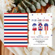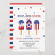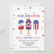 Mignons invitations du parti du 4 juillet avec des photos de popsicles rouges, blancs et bleus en haut. L'expression "pop on over" est écrite en lettres bleues fortes, et le nom, l'âge et l'information de votre enfant sont indiqués en dessous. Les invitations à l'anniversaire du 4 juillet se retournent pour montrer un motif d'arroses rouges et blanches.