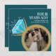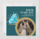 Invitation tes amis et ta famille à une fête spéciale du quatrième anniversaire du mariage ou à la fête du dîner avec ce topaz bleu, et blanc étincelant, anneau éternité graphique, deux photos d'alors, et maintenant invitation. Personnalisé avec vos propres photos du jour de mariage de votre couple et une photo courante au verso, puis ajoutez vos propres mots de célébration, la date de fête et le lieu. D'autres articles correspondants et les années d'anniversaire sont disponibles. Art graphique et design original par www.mylittleeden.com sur Zazzle.