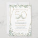 Ces magnifiques invitations à la fête du 50e anniversaire présentent un cadre géométrique en faux or, des chiffres et un script avec une élégante aquarelle verte sur un simple arrière - plan blanc. Une photo mariage du couple se trouve à l'arrière.